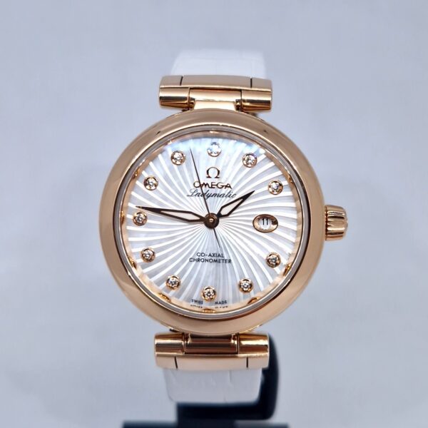 luksusowy zegarek damski z kopertą i klamrą wykonaną z 18-karatowego złota. Tarcza ozdobiona 11 diamentami. Średnica koperty wynosi 34 mm. Wyposażony w datownik, mechanizm automatyczny- kaliber 8521 z rezerwą chodu wynoszącą 50 godzin. Zegarek posiada nowy pasek i jest w stanie jak nowy. W zestawie: zegarek, oryginalne pudełko, dokumenty oraz roczna gwarancja Artemwatch. Omega De Ville Ladymatic 425.63.34.20.55.001 to doskonały zegarek dla osób ceniących sobie funkcjonalność, styl i precyzję wykonania.